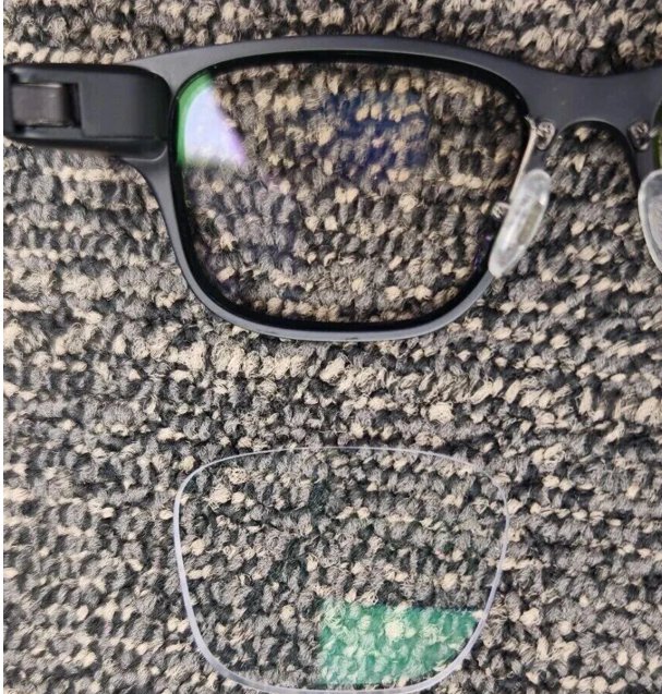 一体化贴合的镜片,采用的是"一面平、一面凹"的设计——平面用于光波导显示,凹面用于矫正近视。
